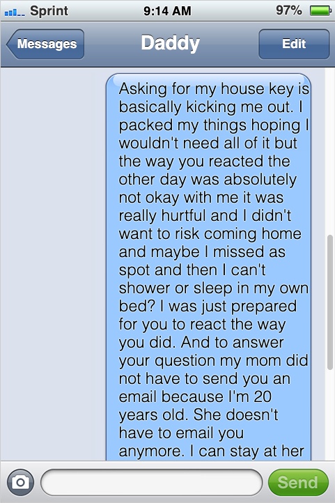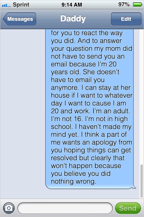 It is amazing how manipulative he is throughout this entire ordeal. She really did not text him that much or talks in a disrespectful way. In fact, she was rather cautious because she knew he would be upset either way. Why didn’t I email him, um… because she is an adult? She is closer to 21 than 20. It is crazy that he pulled me into this situation. My daughter replies to this message with a pretty brave response.