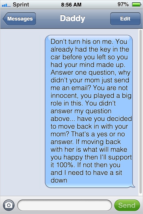She did have to go to work that day and he sent her another message. Meanwhile, I was working on getting her a new used car. My ex had lured her over there 3 1/2 years ago with the promise of a car and no rules. However, over the past year she had more rules than ever. It was turning into such a controlling and unhealthy (toxic) environment.